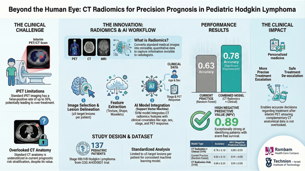 A joint Technion–Rambam project developing an AI-based platform to analyze longitudinal PET-CT scans and improve prediction of treatment response in Hodgkin lymphoma. By moving beyond conventional visual and semi-quantitative interpretation, the project aims to support earlier, more objective, and more personalized clinical decision-making. Why It Matters In Hodgkin lymphoma, early assessment of treatment response is critical. Current PET-CT evaluation methods are valuable, but they remain limited by subjectivity, inter-reader variability, and incomplete characterization of tumor heterogeneity. This can delay treatment adaptation and expose patients to unnecessary toxicity or ineffective therapy.